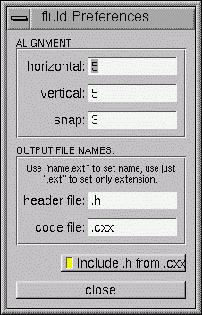 Edit/Group (F7)Creates a new Fl_Group and make all the currently selected widgets children of it.Edit/Ungroup (F8)Deletes the parent group if all the children of a group are selected.Edit/Overlays on/off (Alt+Shift+O)Toggles the display of the red overlays off, without changing the selection. This makes it easier to see box borders and how the layout looks. The overlays will be forced back on if you change the selection.Edit/Preferences (Alt+p)Displays the preferences panel. The alignment preferences control the grid that all widgets snap to when you move and resize them, and for the "snap" which is how far a widget has to be dragged from its original position to actually change. |
